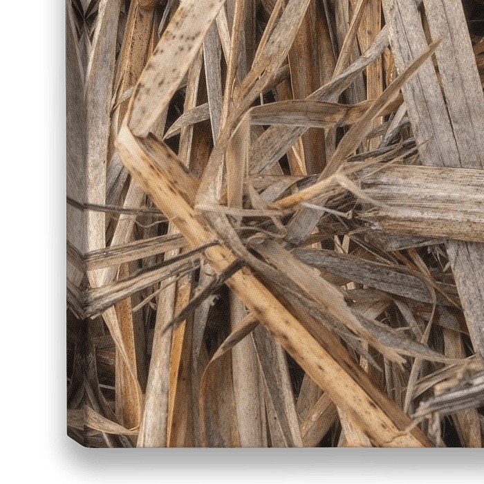 Detailopname van riet, genaamd 'kriskras'. De natuur zorgt zelf voor mooie structuren en vormen, zoals dit afgesneden riet langs een poldersloot.