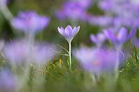 De Krokus is een natuurlijk symbool voor het voorjaar. Hier gefotografeerd vanaf de grond door het gras heen.