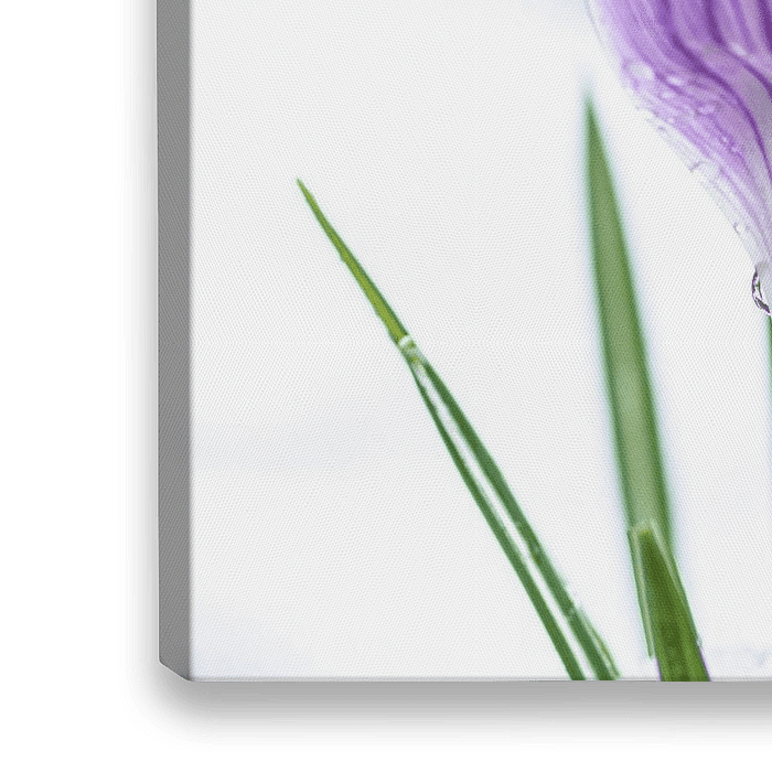 Paars geaderde krokussen nog in de knop. Een flinke regenbui zorgt voor de prachtige druppels die de frisheid van de jonge lente versterkt.