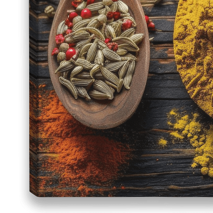 Dit indrukwekkende kunstwerk bestaat uit een serie lepels gevuld met een kleurrijke selectie specerijen. Van hete paprika tot aromatische steranijs, de levendige kleuren en texturen van de specerijen creëren een fascinerende visuele symfonie. Perfect voor fijnproevers en kookliefhebbers die een vleugje exotische specerijen aan hun…