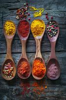 Dit indrukwekkende kunstwerk bestaat uit een serie lepels gevuld met een kleurrijke selectie specerijen. Van hete paprika tot aromatische steranijs, de levendige kleuren en texturen van de specerijen creëren een fascinerende visuele symfonie. Perfect voor fijnproevers en kookliefhebbers die een vleugje exotische specerijen aan hun…