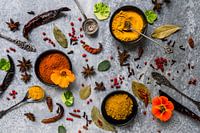 Een lay flat foto met diverse kleurige en fleurige kruiden die je misschien wel dagelijks gebruikt in de keuken. Kurkuma, kerrie, rode peperkorrels, laurierblad, steranijs, kruidnagel en paprikapoeder. Een kleine decoratie van oostindische kers bloemen en blaadjes.