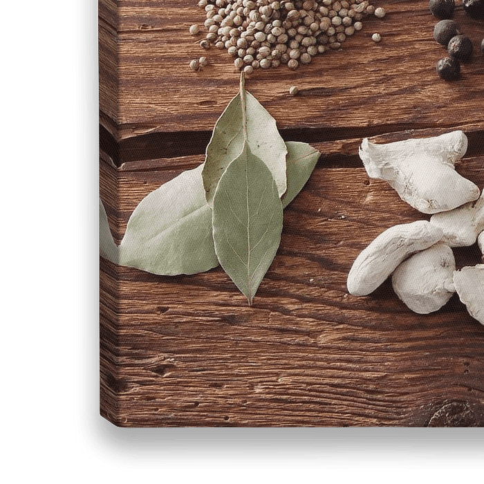 diverse kruiden, saffloer, lavendel, rozenknoppen, kaneel, jeneverbessen, minipaprika's, kamillebloesems, laurier, gember, salie en koriander op houten achtergrond, studiofotografie