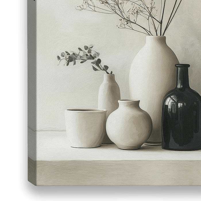 Een minimalistisch kunstwerk waarin gedroogde grassen en bloemen zich verheven presenteren in een verfijnd arrangement van witte en zwarte glazen vazen. De compositie speelt subtiel met contrast en symmetrie, waarbij de delicate takken tegen een rustige, grijze achtergrond een zen-achtige sereniteit uitstralen. Dit kunstwerk belichaamt…