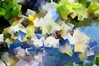Kubistisch abstract werk met geometrische vormen in de kleuren bauw, groen en geel