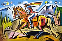 Koop dit landschapskunstwerk Kubistisch schilderij van paard en ruiter van Art & Soul Creations als print op canvas, aluminium dibond, (ingelijste) fotoprint, behang en ArtFrame. Voor jou op maat geprint in Fine-Art kwaliteit.