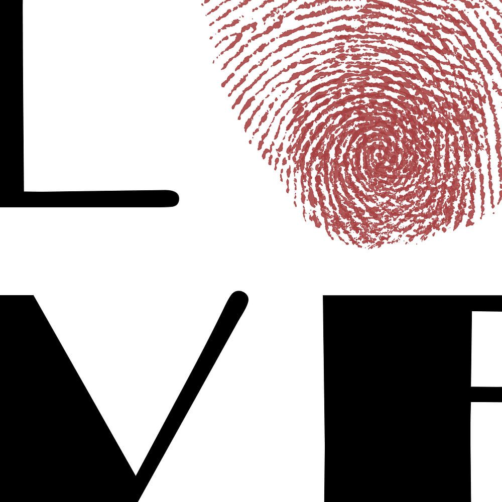 Deze LOVE poster met het rode hart symboliseert hoe bijzonder dat is, namelijk net zo uniek als een vingerafdruk.