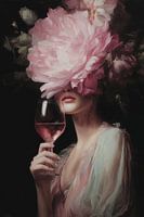 Een stijlvol surrealistisch kunstwerk waarin elegantie en mysterie samensmelten. Een sierlijke gestalte in een luchtige witte jurk houdt een glas rosé vast, terwijl een weelderige roze pioenroos als een betoverend masker het bovenste deel van het gezicht bedekt. De donkere achtergrond en zachte belichting creëren een sfeervolle,…