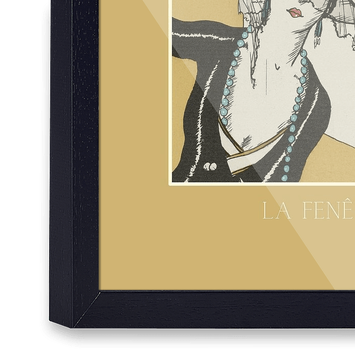 Een historische mode prent in een modern jasje: "La fenêtre". Geïnspireerd door de art deco, een stijlbeweging die opkwam in de jaren twintig van de vorige eeuw. Nieuw zakelijkheid gemengd met moderne strakke lijnen en kleuren.