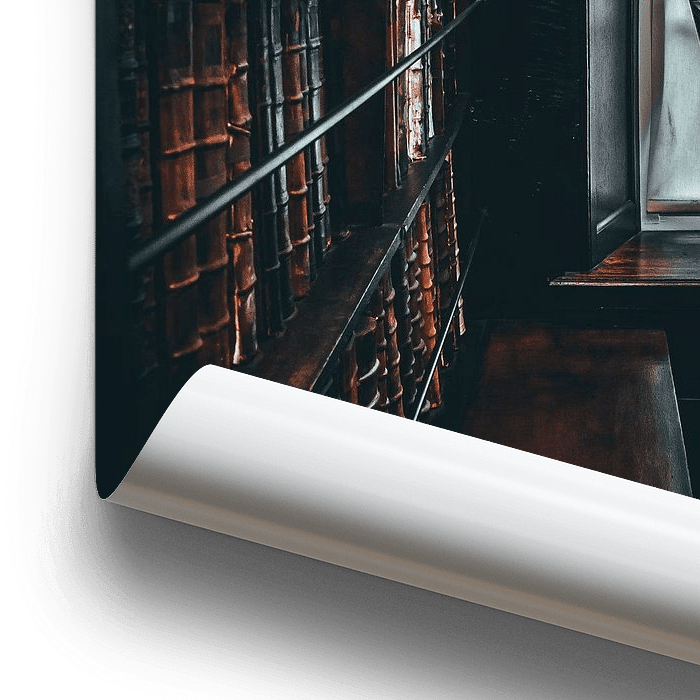 Een houten ladder leunt tegen hoge boekenkasten in Marsh’s Library in Dublin. Het zachte daglicht dat door het raam naar binnen valt contrasteert met de donkere houten planken en eeuwenoude boeken. Dit beeld vangt de spanning tussen licht en schaduw, kennis en mysterie.