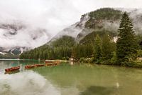 Ochtendmist boven Lago di Braies in de Dolomieten. De Dolomieten liggen in het noorden van Italië, dit is het Zuid-Tirol gedeelte. Het meer gefotografeerd in de vroege ochtend toen er mist boven het meer hing. De bootjes liggen nog voor half 9 vast aan elkaar en vormen zo een lint in het meer.