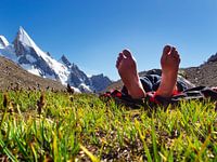 Een bergwandelaar geniet van de zon in het gras met de spitse punt Laila Peak op de achtergrond. Karakoram gebergte, Pakistan. Deze afgelegen regio van de Himalaya is geliefd bij expeditie klimmers en lange afstand wandelaars. In de buurt liggen onder meer de K2 en Broad Peak.