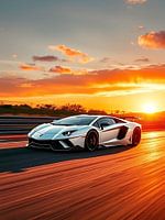 Koop de foto Lamborghini Aventador Witte Zonsondergang 2 van MIROKKU als print op canvas, aluminium dibond, (ingelijste) fotoprint, behang en ArtFrame. Voor jou op maat geprint in Fine-Art kwaliteit.