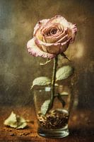 De compositie is bewust eenvoudig gehouden, met een bijna meditatieve focus op de gedroogde roos in een glas, terwijl de imperfecte uitsnede een gevoel van nostalgie oproept. Dit werk vertelt niet alleen het verhaal van een bloem die haar bloei achter zich heeft, maar ook van de verstrijkende tijd en de schoonheid die in verval schuilt. De warme, aardse tinten voegen een rustieke, landelijke sfeer toe, terwijl de texturen en craquelé-effecten een diepte en karakter geven die doen denken aan vroegere fotografische technieken.
