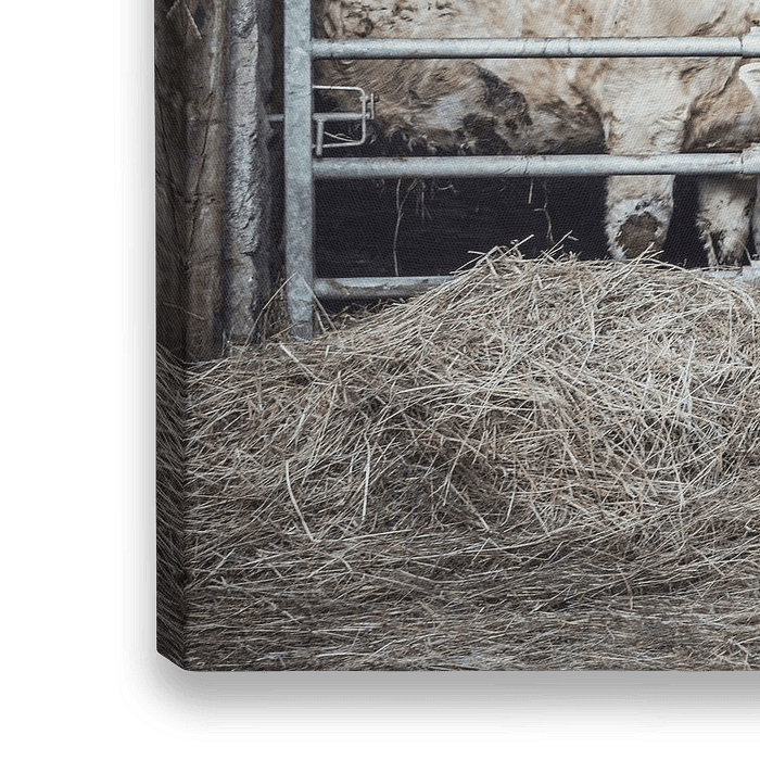 in deze prachtige foto van een koeienstal, genomen in het voorjaar in Frankrijk, zien we een idyllisch landelijke scène. Een moederkoe staat beschermend naast haar kalfje, beide koeien genieten van de rust in de stal. Naast de koeien zit een kat op een strobaal, zich koesterend in het zonnetje dat door een open deur naar binnen schijnt. De sfeer van de stal is rustiek en verweerd, wat bijdraagt aan de authentieke sfeer van deze landelijke natuur. Dit beeld straalt rust en harmonie uit, perfect passend bij het serene Franse platteland.