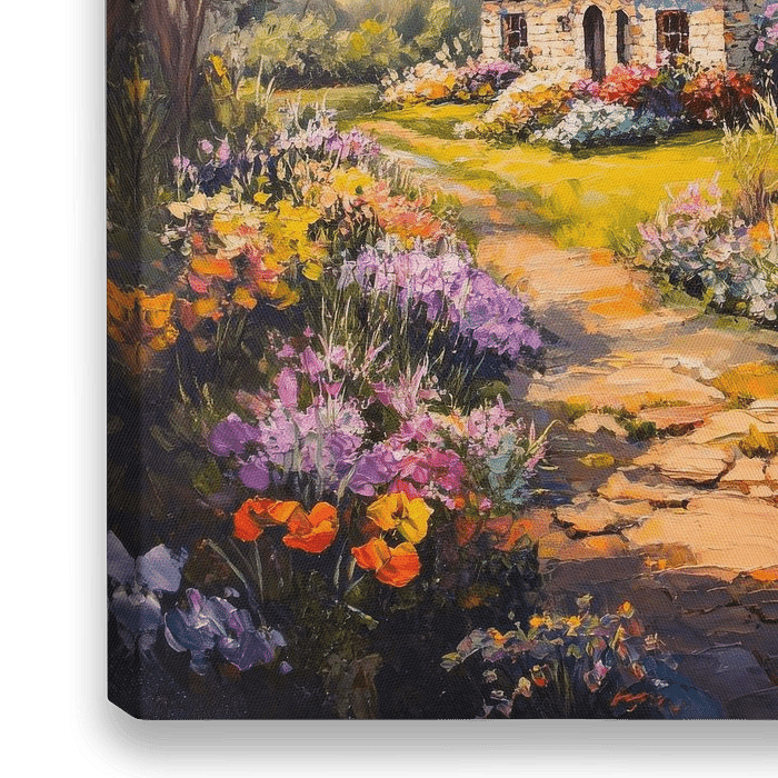 Een pittoresk huisje met een rieten dak nestelt zich zachtjes in een waas van kleurrijke bloemen. Het uitnodigende pad slingert door het weelderige groen en leidt naar de majestueuze bergen op de achtergrond. De zachte wolken in de lucht geven het tafereel een dromerige sfeer die uitnodigt om te blijven hangen.