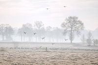 Op een koude decembermorgen met nevel zetten ganzen de landing in en voegen zich bij een ander groepje ganzen. Nevel en de opkomende zon brengen een mooie sfeer over het berijpte landschap van de Wouwse Plantage, Noord-Brabant