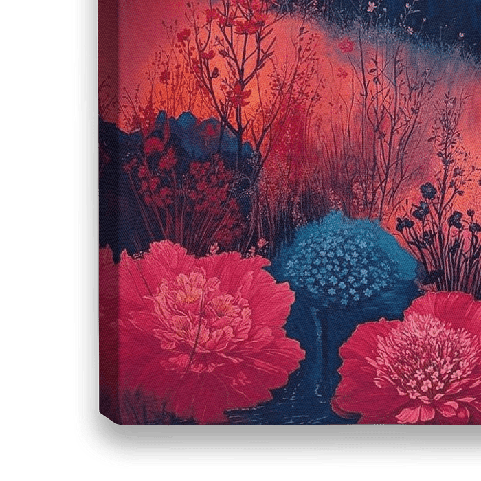 Details: bloemen, bergen, zonsondergang, abstract, kleurrijk, roze, blauw, rood, landschap, modern