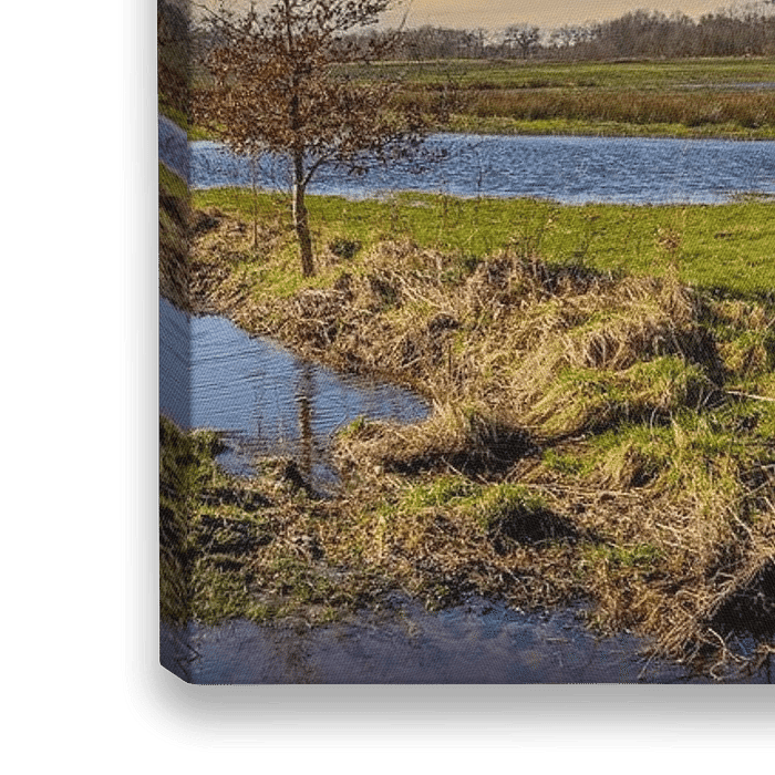 Zonsonderganglandschap van het stroomgebied van het Gastersche Diep, onderdeel van de Drentse Aa. Na extreme regenval treedt de beek buiten haar oevers en overstroomt het moeras langs de oevers