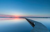 Landschap, wandelpad over het water bij ondergaande zon (Groningen)