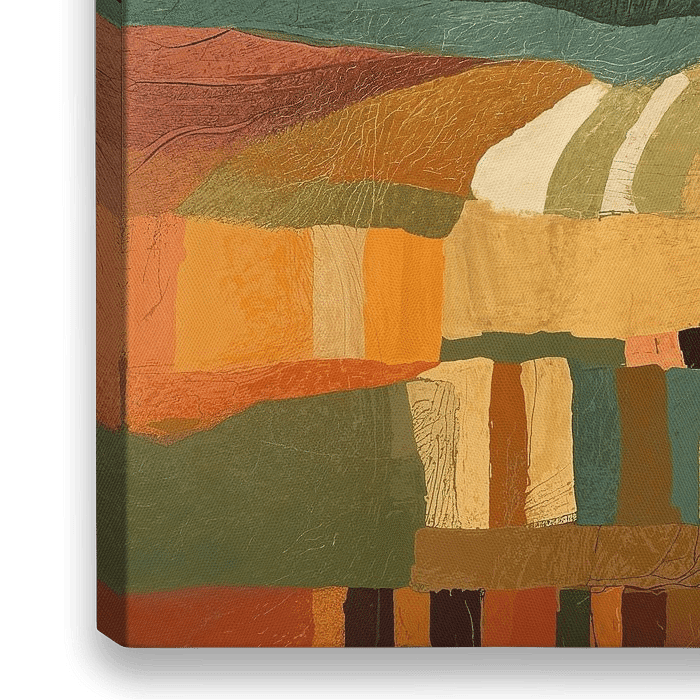 Dit landschap schilderij neemt je mee naar een betoverend landschap. Warme kleuren zoals oranje en rood brengen samen met de blauwtinten een gevoel van warmte en gezelligheid in de ruimte, in het landschap.