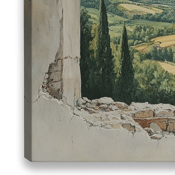 Landschap - Dit landschapsschilderij biedt door een ruwe, afgebrokkelde muuropening een betoverend uitzicht op glooiende heuvels en rijen bomen onder een bewolkte hemel.