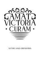De illustratie toont de Latijnse spreuk "Amat Victoria Curam", vakkundig vormgegeven in een elegant schreeflettertype. De letters zijn versierd met florale ornamenten en decoratieve elementen die het geheel een klassieke en elegante uitstraling geven. Onder het citaat staat de Engelse vertaling "Victory loves preparation", wat het…