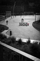 Zicht op de nieuw ontwikkelde wijk 'Le Nid' in Namen in Wallonië, België. "Namur" staat in grote letters over het oppervlak geschreven met de ondergaande zon die lange schaduwen werpt, wat de stedelijke omgeving van het gebied benadrukt. De color pop-techniek is goed gebruikt met het rode hart naast het bord van Namen. Zwart-wit…