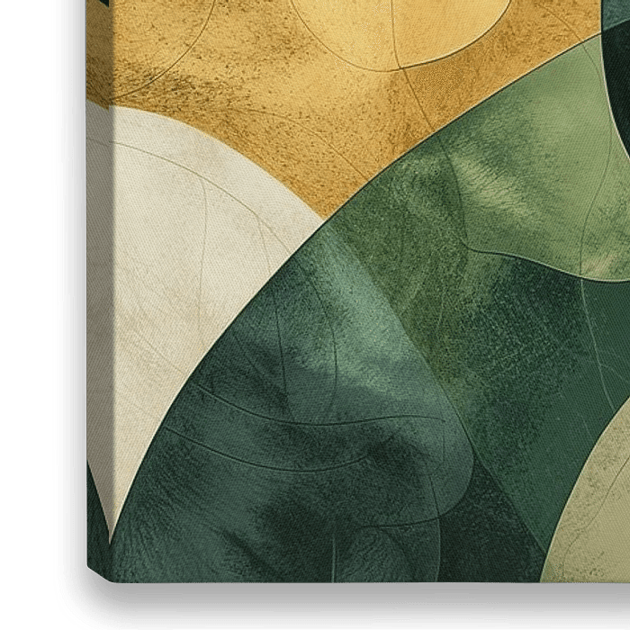 Leaf Whispers - Dit abstracte bladeren schilderij toont een intrigerende compositie van organische vormen en lijnen die de essentie van bladeren en natuurlijke elementen nabootsen, samengevoegd in een harmonieuze abstracte expressie. De hoofdelementen zijn gestileerde bladeren, uitgevoerd in verschillende kleurschakeringen van groen,…