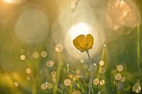 Close up van een boterbloempje , met zonnige bokeh op de achtergrond. De bokeh druppeltjes zijn doormede meervoudige belichting aan de foto toegevoegd.