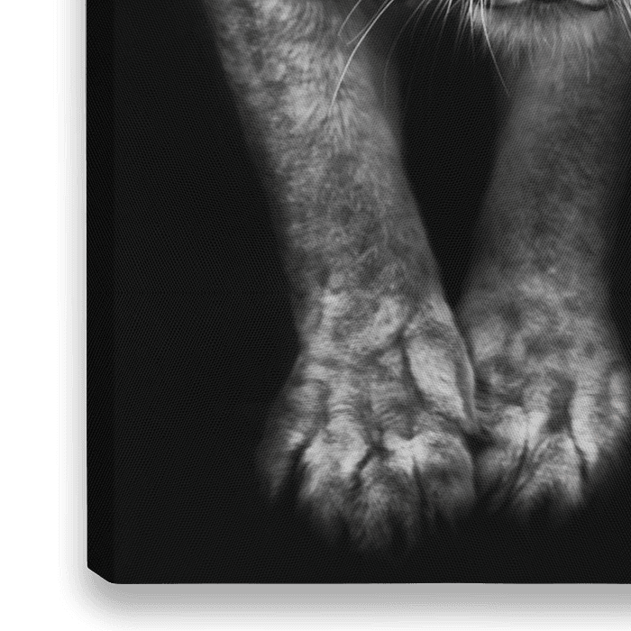 Koop dit leeuwen kunstwerk Leeuwin met uitgestrekte poten in verkleurd maanlicht en gloeiende ogen geïsoleerde zwarte achtergro van Michael Semenov als print op canvas, aluminium dibond, (ingelijste) fotoprint, behang en ArtFrame. Voor jou op maat geprint in Fine-Art kwaliteit.