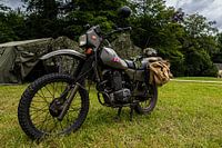 Groene fraaie legermotorfiets uit de 2e Wereldoorlog staand in het grasveld .