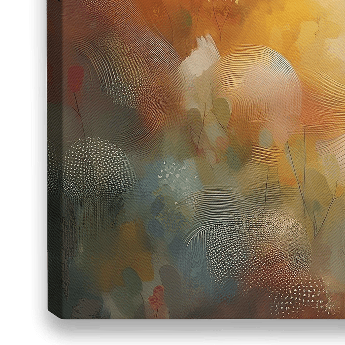 Lente ontwaakt; een sfeervol abstract kunstwerk waarin de lente tot leven komt in een zachte harmonie van bloemen en natuur. Warme tinten van goud, beige, oranje, geel en groen vloeien subtiel over en creeren een rustgevende, moderne uitstraling. de transparante lagen en organische vormen geven het werk diepte.