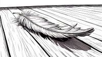 Een enkele, delicate veer ligt op een lichtgekleurde houten vloer en werpt een duidelijke schaduw die de fijne details en de nerven van het hout benadrukt.