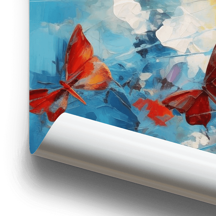 De kunstwerken uit de serie "Let Spring Begin" hebben een nieuwe dynamiek gekregen met "Lentedans". Deze creatie onderscheidt zich door de prominente oranje vlinders die een gevoel van lichtheid en vreugde brengen. De vlinders zweven boven een achtergrond van verkoelend blauw en warme herfsttinten, wat zorgt voor een spannend contrast…