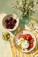 Dit schilderij viert de schoonheid van eenvoudige dingen: rijpe kersen, verse tomaten met mozzarella, groene olijven en een zacht boeket bloemen in pastelkleuren. Met warme zonlicht en zachte schaduwspelen creëert het kunstwerk een sfeer van Mediterrane ontspanning en culinaire vreugde. De illustratieve stijl met gedurfde lijnen en…
