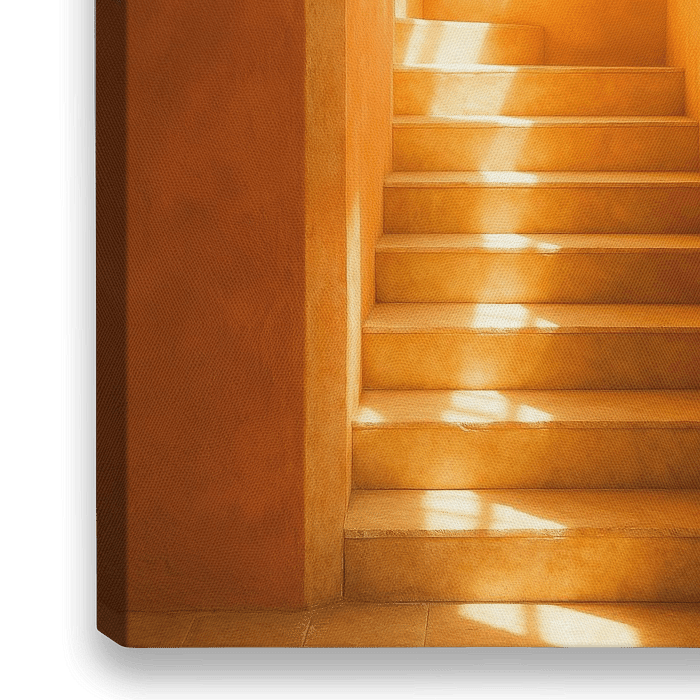 Een zonovergoten trap in warme aardetinten nodigt uit tot ontdekking, met het licht dat speels door een raam valt en een serene sfeer creëert. De combinatie van eenvoud, symmetrie en kleur maakt dit beeld perfect voor een minimalistisch en sfeervol interieur.