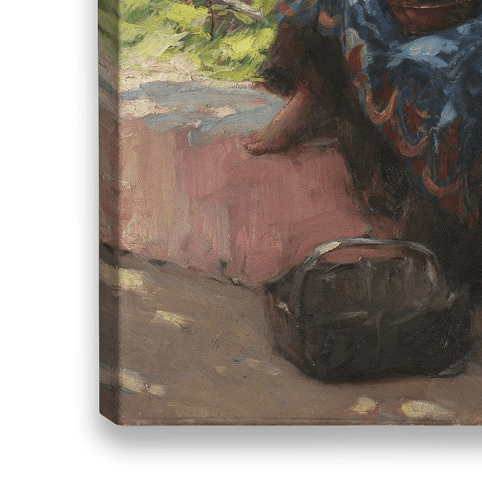 Liefdevolle aandacht, José Malhoa (1910) Voorstelling van een jonge vrouw gezeten op de hoek van een laag muurtje rondom een moestuin, in de schaduw van takken. De vrouw rust met haar elleboog op haar been en haar gezicht op haar hand.