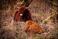Op een mooie winterse dag ligt de Schotse Hooglander samen met haar kalf tussen de bomen en takken in het droge platgelopen hoge gras.