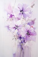 Dit digitale schilderij toont een prachtige verzameling van lila bloemen. De bloemen lijken te dansen op het canvas, met zachte, transparante bloemblaadjes die een etherische sfeer creëren. Subtiele spatten en druppels van verf geven het stuk een losse en vrije uitstraling.