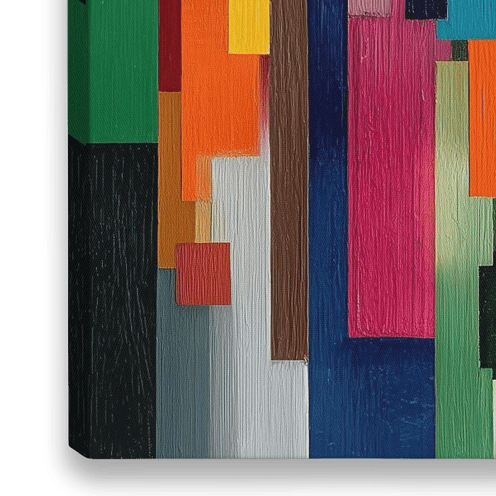 Een abstract kunstwerk van verticale lijnen in verschillende kleuren, wat een illusionistisch effect creëert met overlappende lagen die het diepte en dimensie geven.