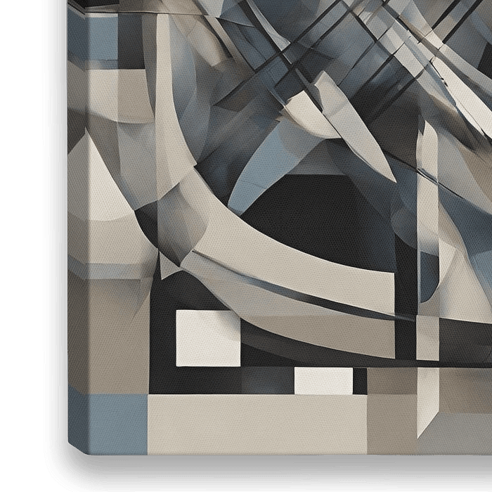 Strakke lijnen en abstracte vormen die een complexe compositie vormen. De kleuren blauw, grijs, wit en zwart zijn op een harmonieuze manier verdeeld over het doek, waardoor een gevoel van orde en symmetrie ontstaat. De overlappingen en intersecties van de vormen creëren diepte en beweging.