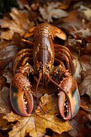 Een herfstportret. Een bruine kreeft temidden van prachtige herfst bladeren. Een schakering van diverse natuurlijke bruin tinten. En een grappige combinatie van een zeedier op het land.