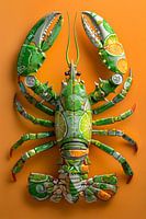 Prachtige kreeft in pop art stijl in groen / gele tint op een oranje achtergrond. De kreeft lijkt gemaakt van citroen frisdrank blikjes.