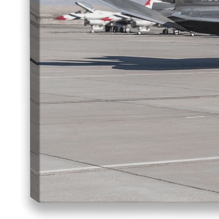De Lockheed Martin F-22A, Block 20, registratie AF 04-068, gestationeerd op Nellis air Force Base (OT) komt voorbij getaxied na afloop van de zogenaamde heritage flight tijdens de Aviation Nation Airshow 2016.