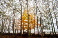 In een mistig bos, één van de weinige bomen die zijn bladeren nog heeft.