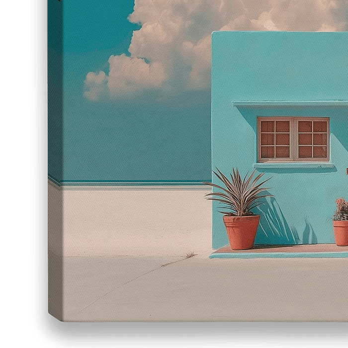 Een minimalistisch, klein turquoise huisje met potplanten en roze bougainville ervoor, tegen een achtergrond van een wit woestijnlandschap en een blauwe lucht met een grote wolk aan de horizon. Dit kunstwerk legt de serene en simplistische schoonheid van het tafereel vast.
