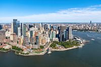 De foto is gemaakt vanuit een helicopter en laat de vele wolkenkrabbers zien van het Financial District in deze wereldstad. Dit gedeelte van het stadsdeel Manhattan ligt op de splitsing van de rivier Hudson en de East River.