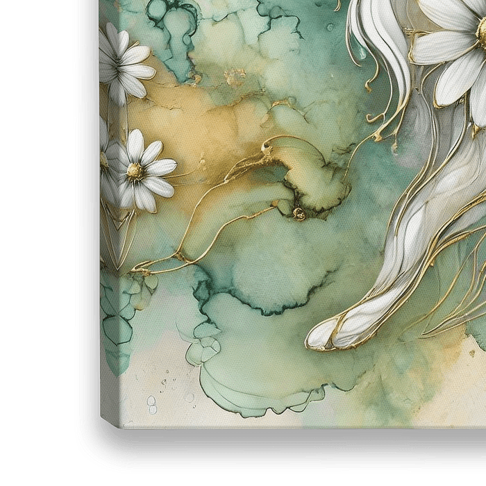 De hond, het ultieme symbool van vriendelijkheid en liefde, vormt samen met de madeliefjes een harmonieus geheel dat zowel rust als kracht oproept. De zachte kleuren en vloeiende lijnen, geïnspireerd door aquarel- en inkttechnieken, brengen een dromerige sfeer die perfect past in elk interieur.