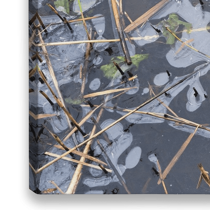 Een detailopname van een stuk natuurijs. Afgesneden riet stak boven het ijsoppervlak en vormde een mooie onderbreking van de ijsstructuren.